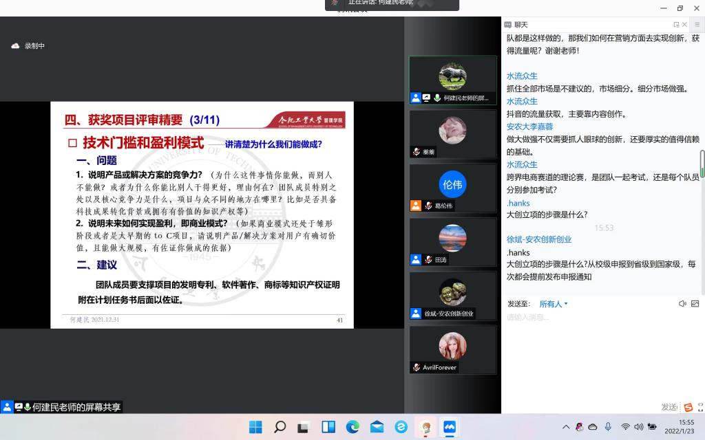 本网讯 为提升电子商务“创新、创意及创业”挑战赛参赛团队的能力水平和项目质量,1月23日下午,我校特邀大赛组委会秘书长、合肥工业大学何建民教授担任主讲嘉宾,开展挑战赛线上专题培训会。校创新创业学院常务副院长徐斌,经济管理学院党委副书记吴国卿、副院长田涛,各参赛团队队长以及指导教师近500人参加了会议,培训会由经管学院副院长田涛主持。