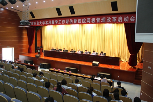 本网讯 5月12日上午,我校在图书馆第一报告厅召开教育部本科教学工作评估暨校院两级管理改革启动会。在校的全体校领导,校直部门副处以上、学院党政正职(含主持工作的副职),省级以上“两代表一委员”,民主党派市级以上主委,教代会执委,正高职称人员参加了大会,会议由校党委副书记李恩年主持。