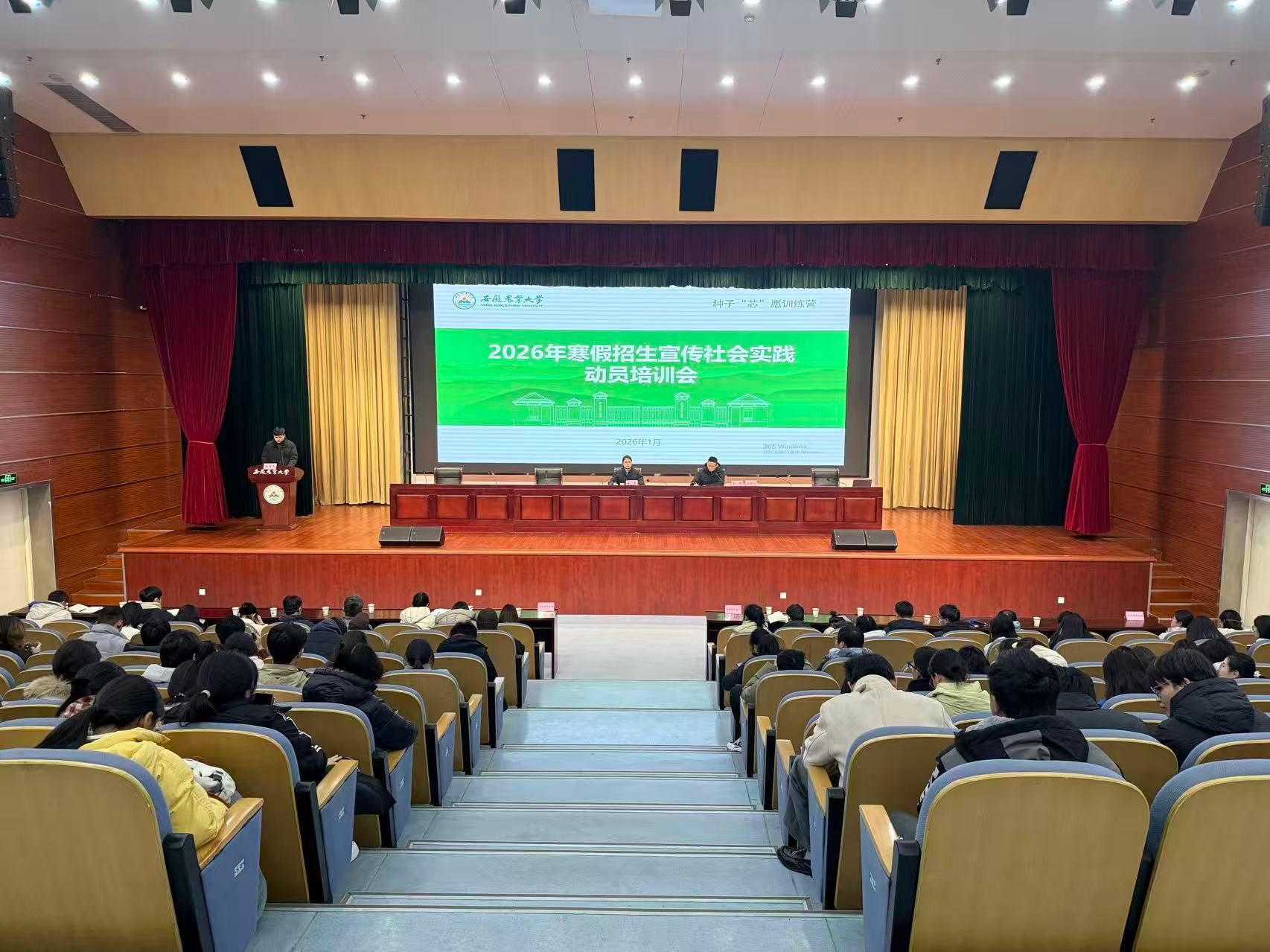 本网讯 1月6日,安徽农业大学2026年寒假招生宣传社会实践活动动员大会在图书馆一号报告厅举行。教务处副处长、招生办公室副主任钱慧作动员讲话。各学院招生工作负责老师、299支实践团队负责人参加动员会。