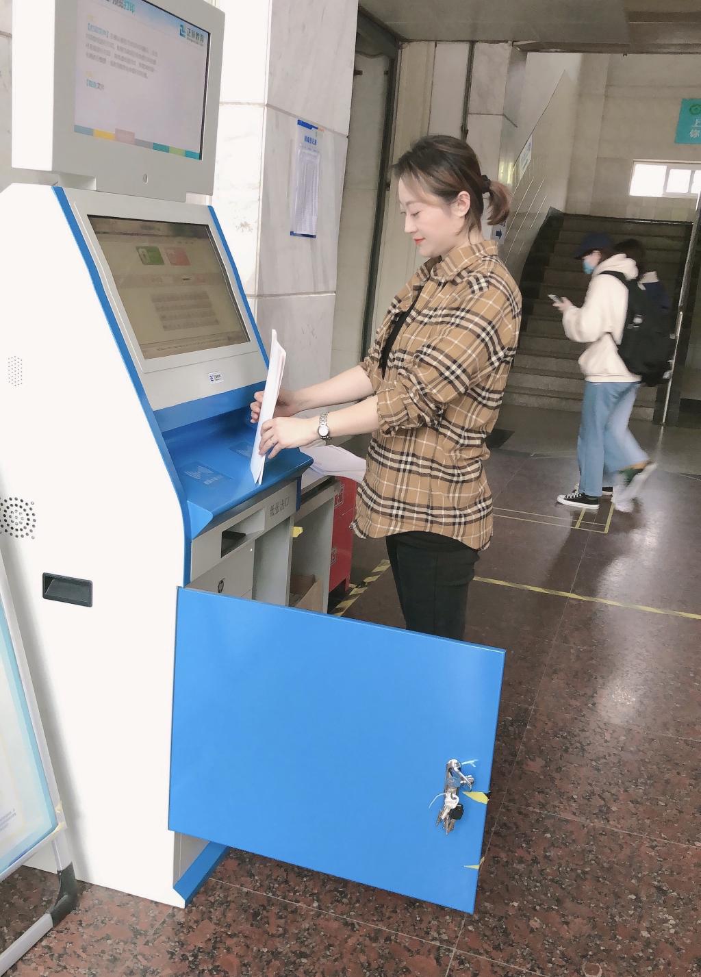 目前我校共有成绩单自助打印机器3台,分布在勤学楼、博学楼和学生服务中心(欣苑食堂3楼)。教务处支部安排专人负责维护,根据成绩单打印需求量的大小,采用忙时每天检查,闲时定期维护的方式,保障机器纸量充沛、运转正常,切实为学生办好小事、实事。